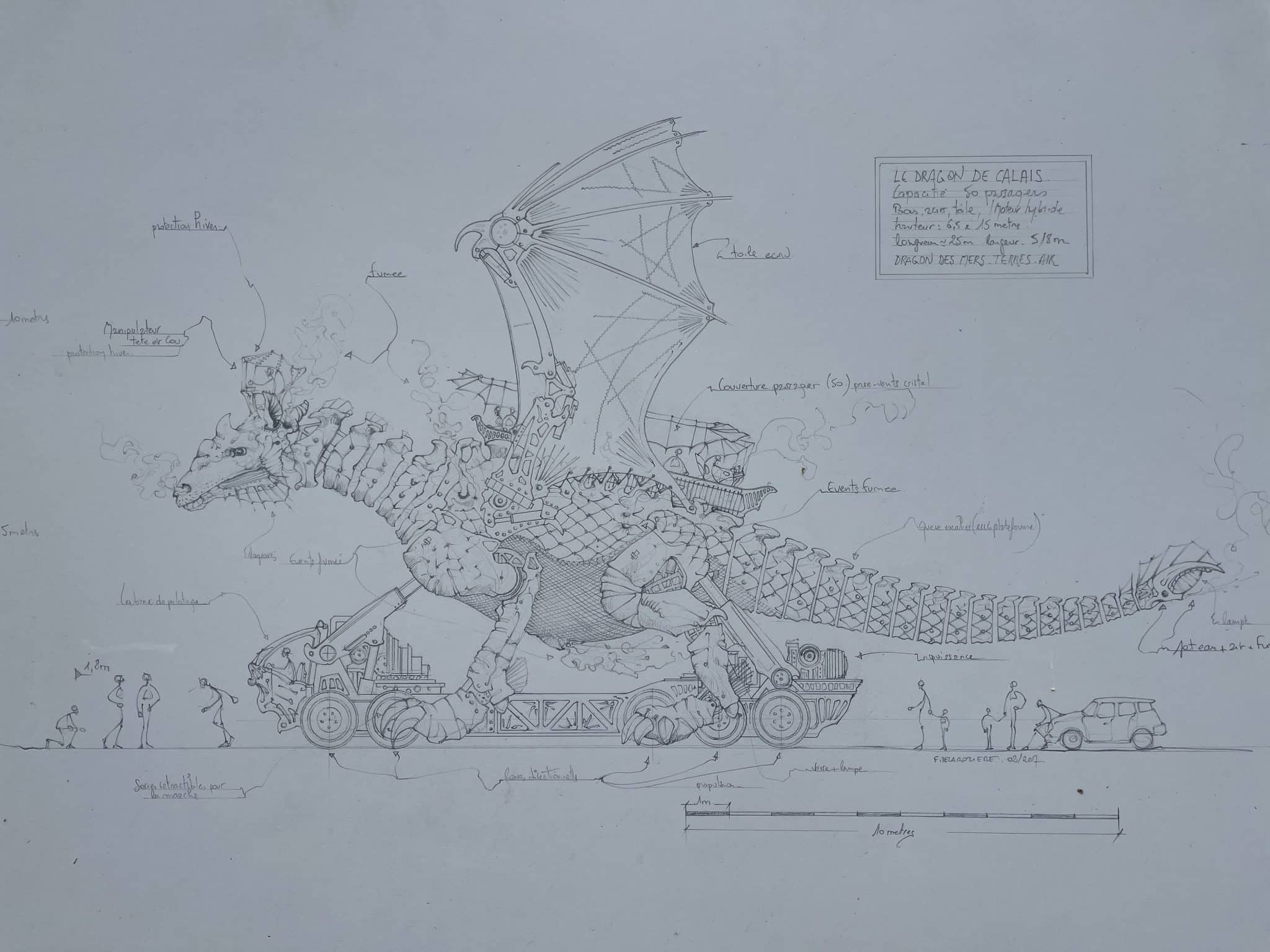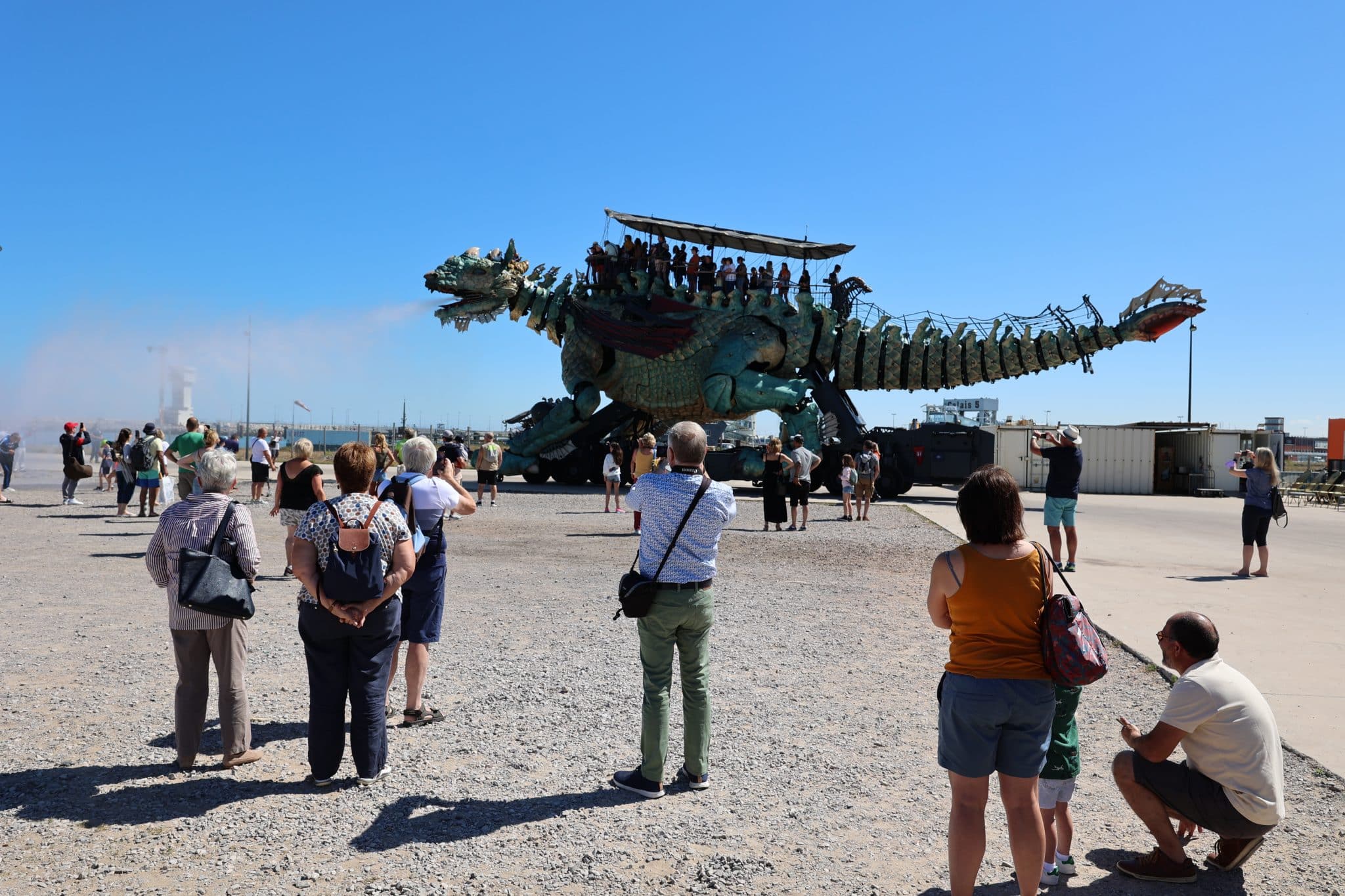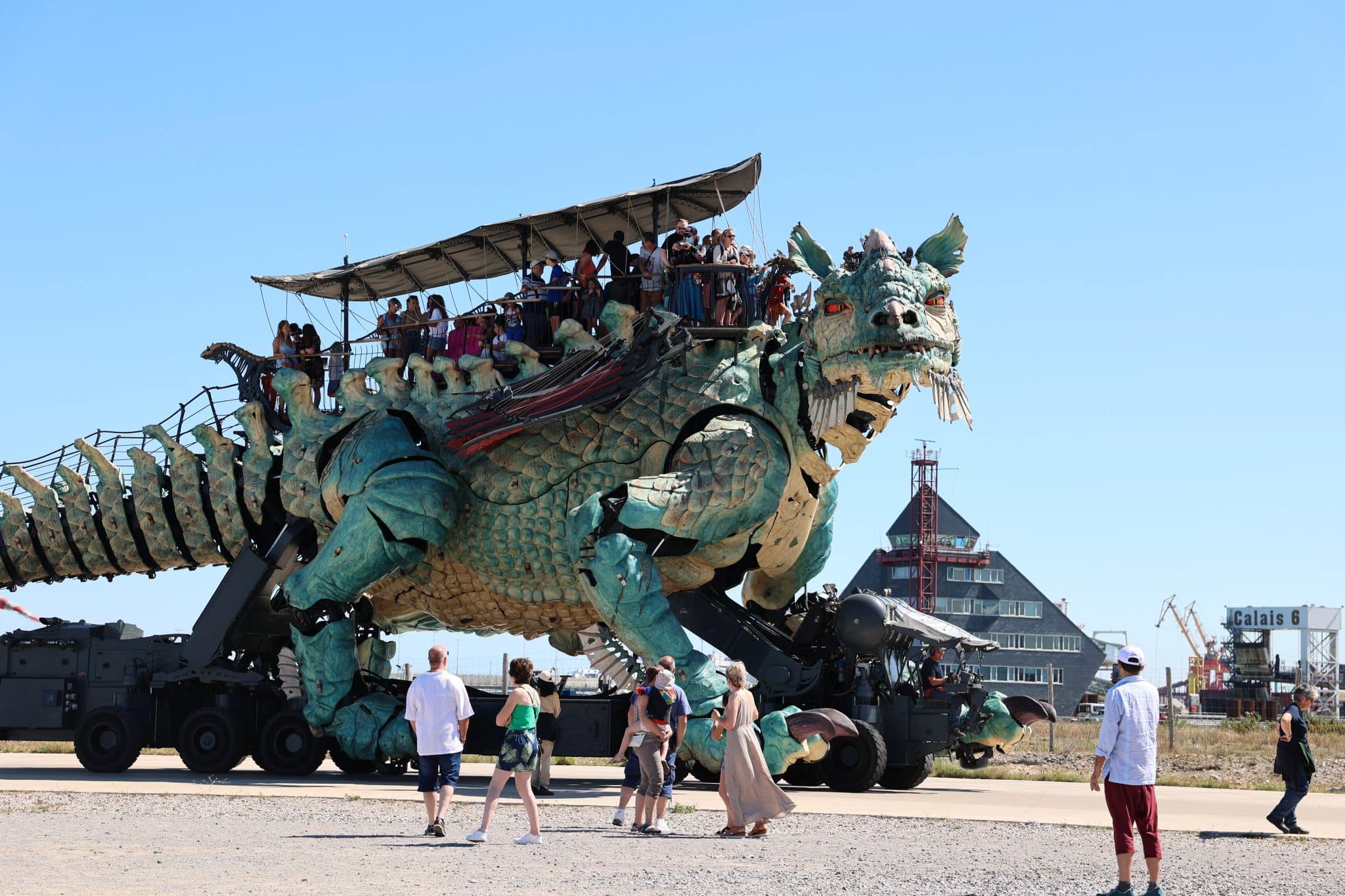 Mais c’est à Calais, sur la Côte d’Opale, que l’imaginaire de François Delarozière trouve aujourd’hui l’une de ses expressions les plus monumentales. Depuis 2019, le Dragon de Calais s’est enraciné au bord de la mer. Long de 25 mètres, cracheur de feu, d’eau et de fumée, il transporte les visiteurs le long du front de mer comme un gardien veillant sur la ville.